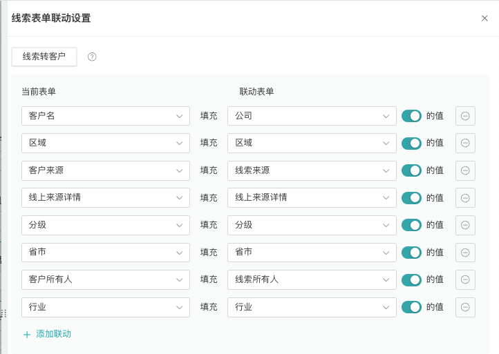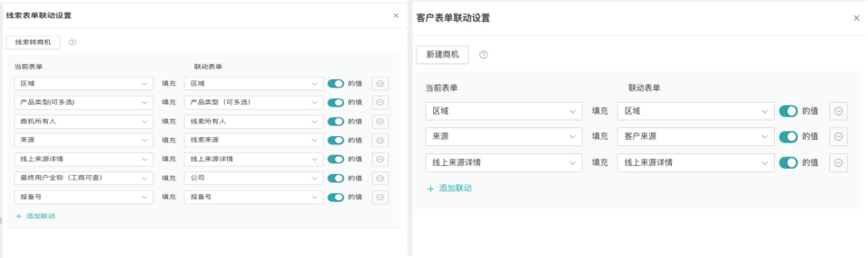 其中客户信息可以由销售专员录入,也可以通过线索直接转化。其中转化时客户和线索表单的联动参见如下图所示。