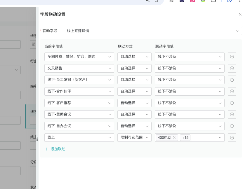 其中针对来源渠道是线上的线索,需要进一步补充线上来源详情,参见如下,通过将「线索来源」字段与「线上来源详情」字段进行联动设置,即当线索来源为多期续费、维保、扩容、增购等线下线索联动为线下不涉及,而针对线上的线索则需要根据可选范围选择是400电话或者安装包下载等方式具体线上来源渠道。
