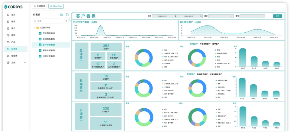 基于 DataEase 的数据可视化分析,则通过 DataEase 与 CRM 数据源对接,同步获取到CRM中的用户数据访问权限,然后支持管理员基于DataEase或者嵌入CRM的DataEase进行 BI 分析。其中包含客户分析、线索分析、新增商机分析、开放商机分析等等。