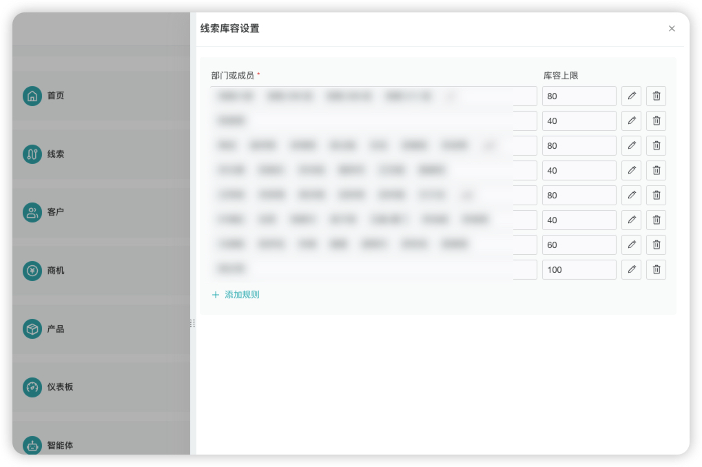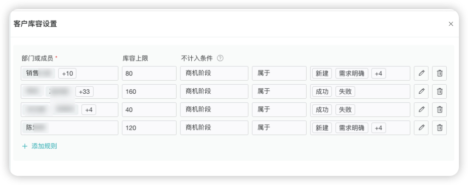 客户的库容设置,根据不同的人员以及部门进行独立库容规则设置,其中同时根据商机阶段设置不计入库容的条件,满足各种库容规则管理的设置要求。这其中主要分为几个档位,包括 40、80、120、160 等几个档位,库容设置过程主要考虑了个人能力、负责的业务市场、往年销售业绩、入职年份等因素。