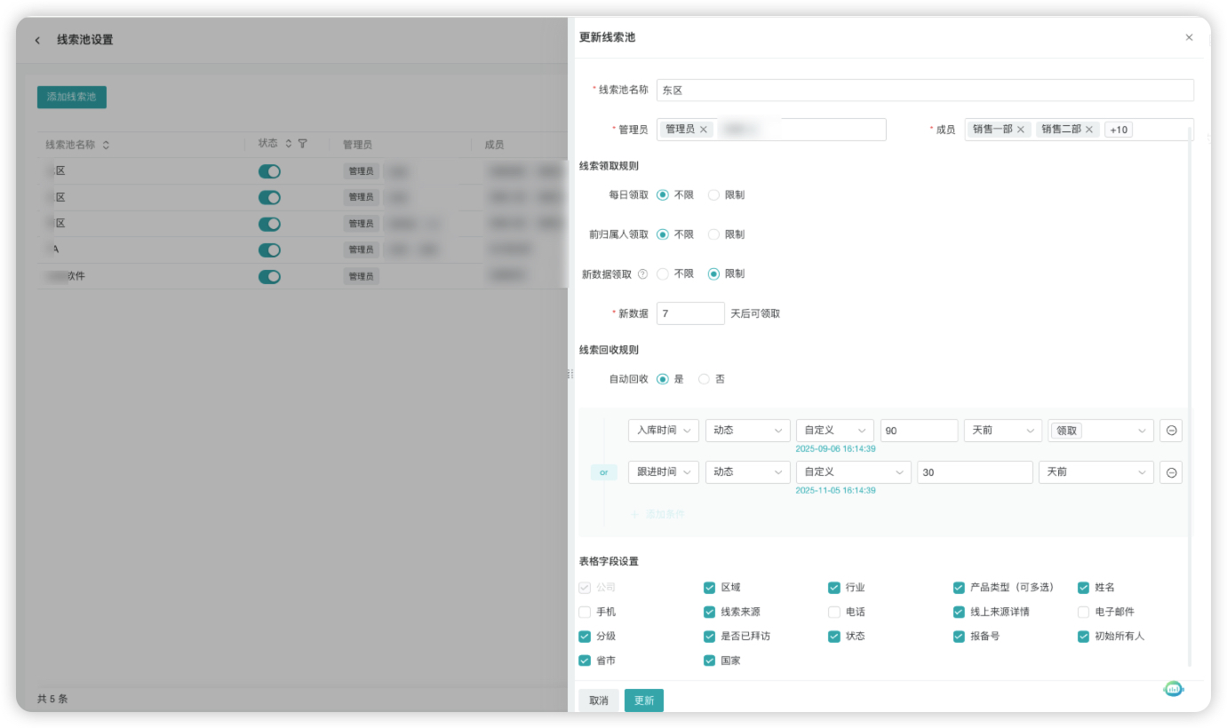在 Cordys CRM 中针对不同的部门设置不同的线索池,每个线索池自定义了不同的领取回收机制。可以通过线索池和生效成员进行控制范围管控。如下图所示,根据不同的部门共创建了5个线索池,其中以某个区域的线索池管理规则为例,其线索领取、回收以及显示规范如下所示: