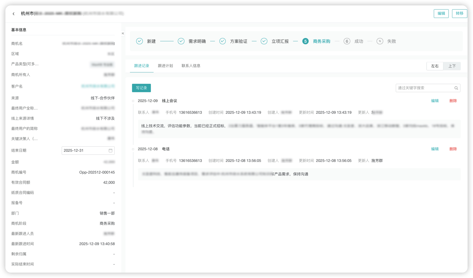 同时在商机管理过程中销售专员需要实时记录跟踪记录、完成跟进计划安排等,保证商机跟进信息完整,管理人员方便了解商机跟进具体情况,完成有效的Review。
