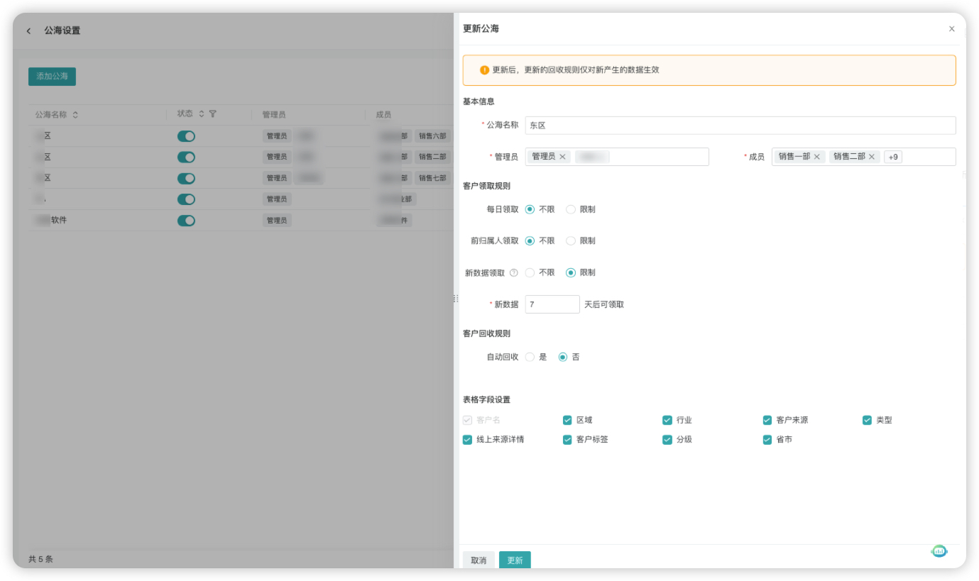 公海按照部门进行划分,其中不同部门设置不同的客户领取以及回收机制。如下图所示,以东区为例,每日领取不限、前归属人领取不算,但是新数据领取时同样有客户7天限制,同时在公海中的所有客户无法看到客户联系人以及跟踪进展信息,防止销售肆意联系打扰客户。回收规则可根据实际情况进行设置。