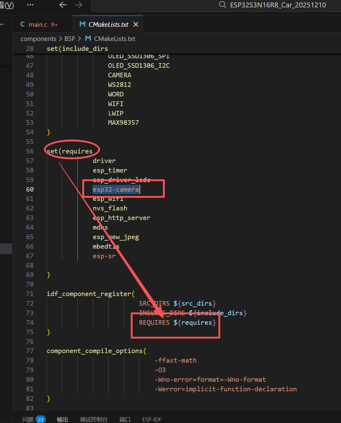 2.在CMakeList文件里面添加这个esp32-camera依赖库