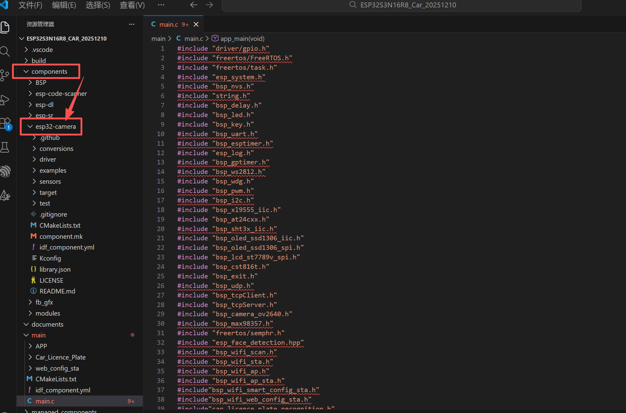 把刚才在乐鑫官方Github里面下载的摄像头驱动库解压放到工程的components文件夹里面: