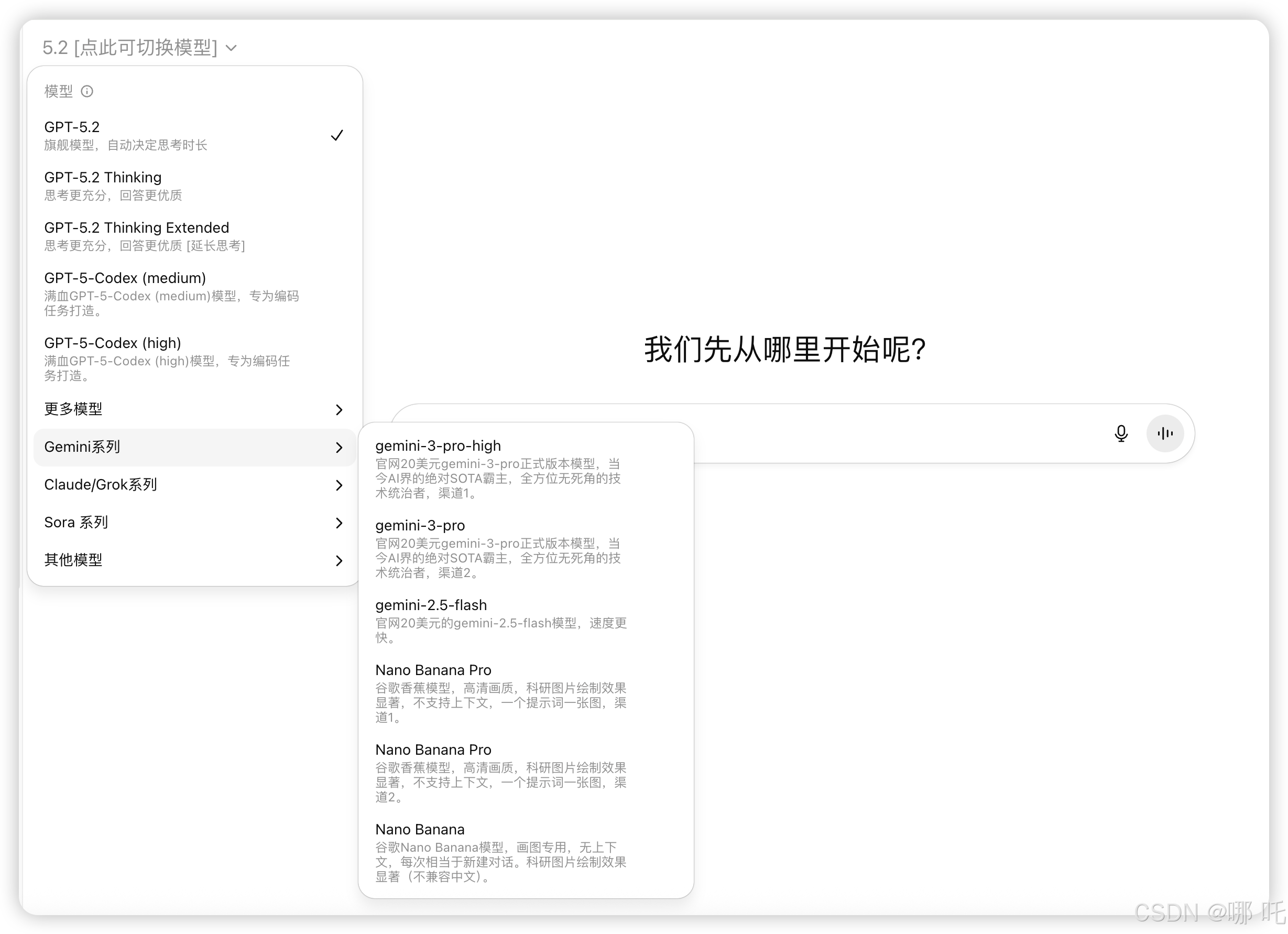 包含GPT-5.2、GPT-5.2 Thinking、Gemini 3 Pro、Nano Banana Pro、Claude Sonnet 4.5、Codex、Sora2、Grok4.1等模型。