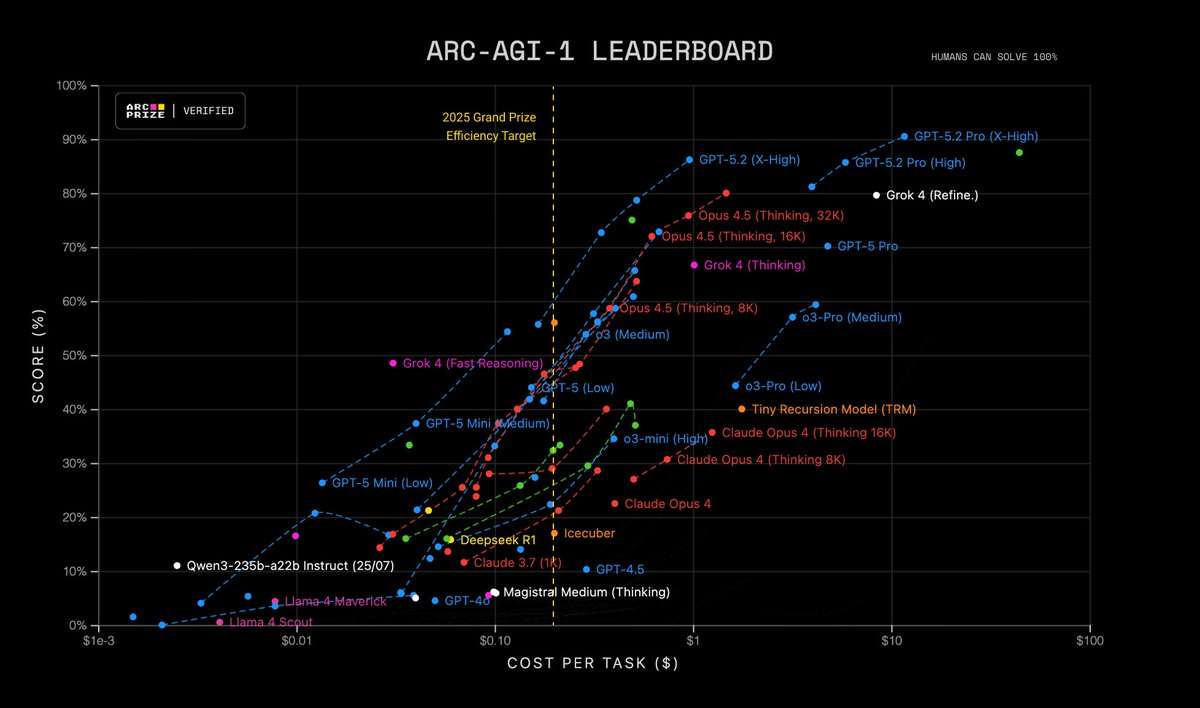 ARC-AGI-1 智能推理排行榜。横轴是单题成本,纵轴是解题成功率,用来比较各大AI模型在复杂抽象推理任务上的能力与效率。