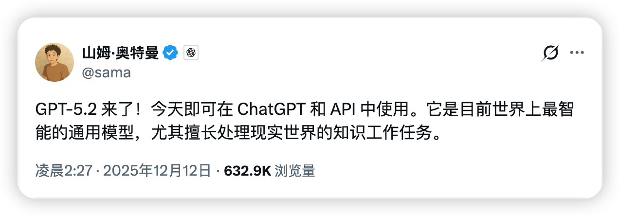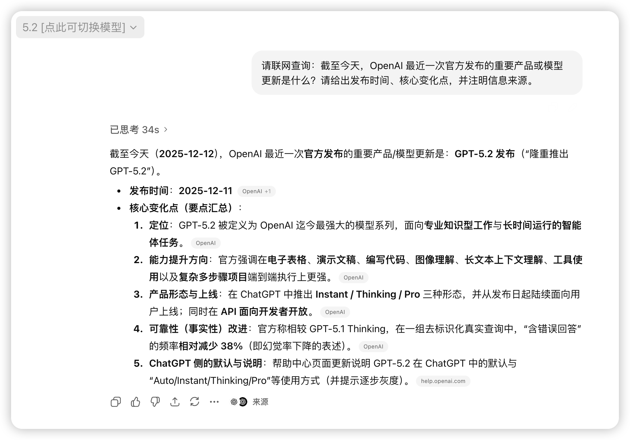 OpenAI 最新发布的 GPT-5.2 整体更聪明、更可靠,尤其是在减少"胡说"方面进步明显。