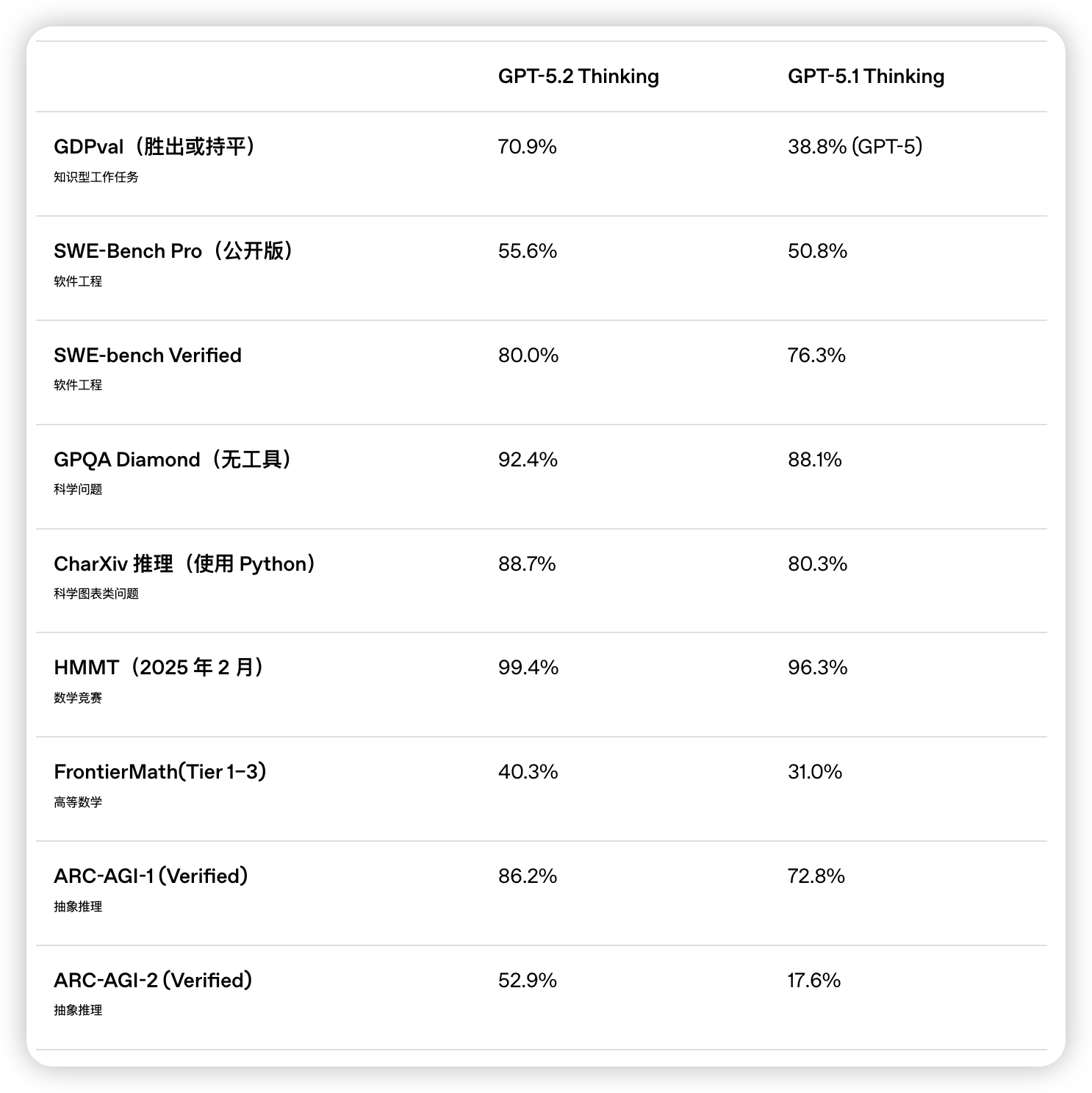 上线三种模型,GPT‑5.2 Instant、GPT‑5.2 Thinking 和 GPT‑5.2 Pro。
