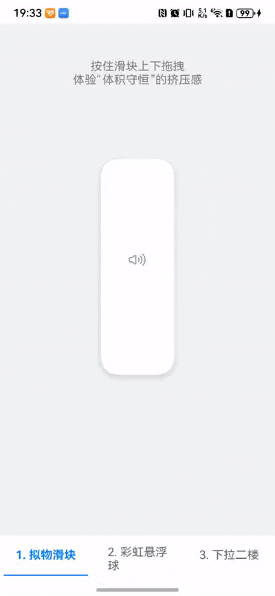 普通的滑块只是高度变化,而"拟物化"滑块会有体积感 :当你用力拉长它时,它会变细(拉伸);当你用力按压它时,它会变粗(挤压)。这符合物理学中的体积守恒定律。
