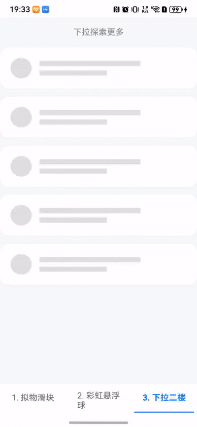 下拉刷新大家都很熟悉,但如何做一个**"有质感"**的下拉二楼?关键在于阻尼系数的调教。不能是线性的 1:1 跟手,而应该有一种"把重物拉下来"的沉重感。