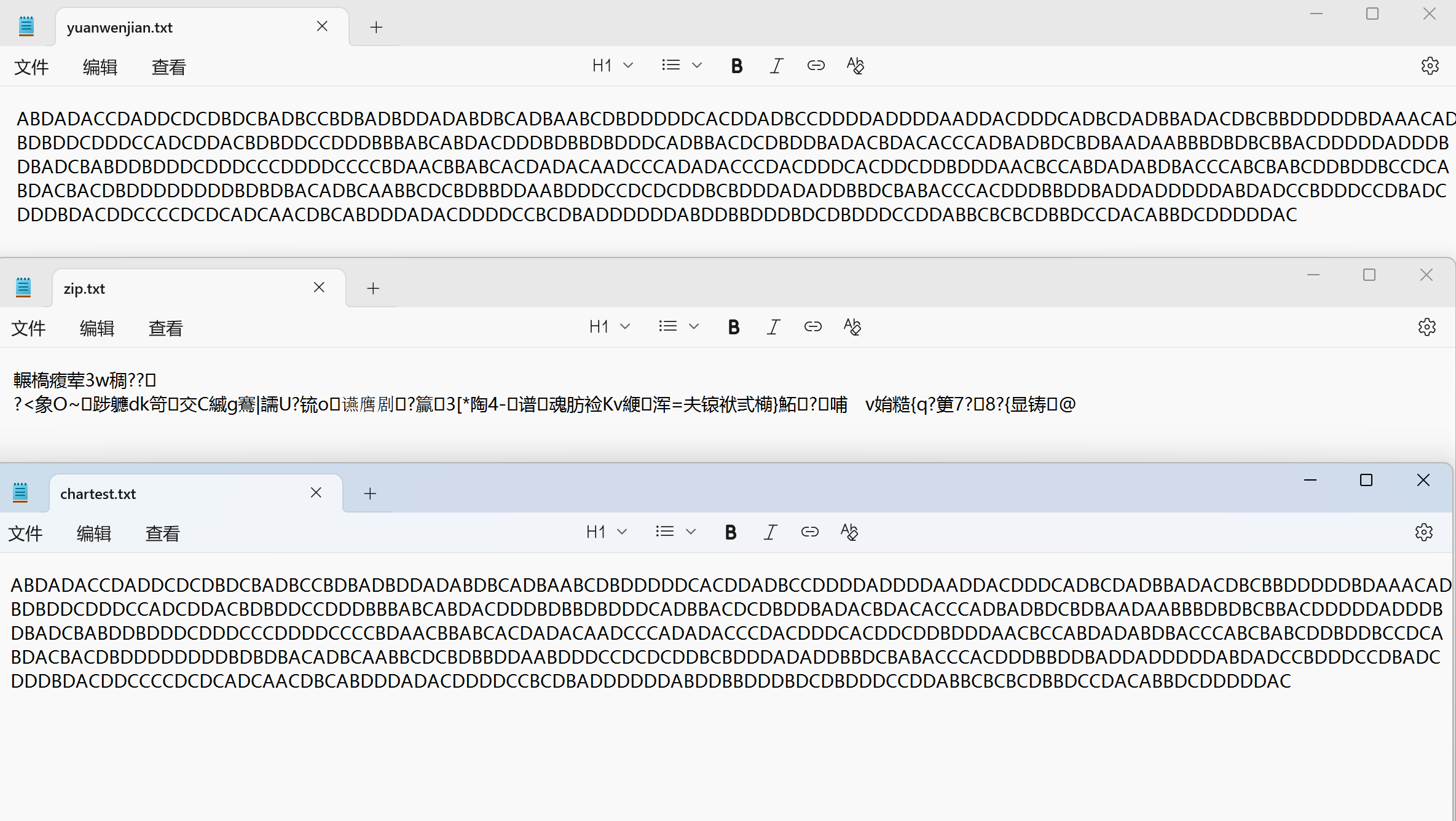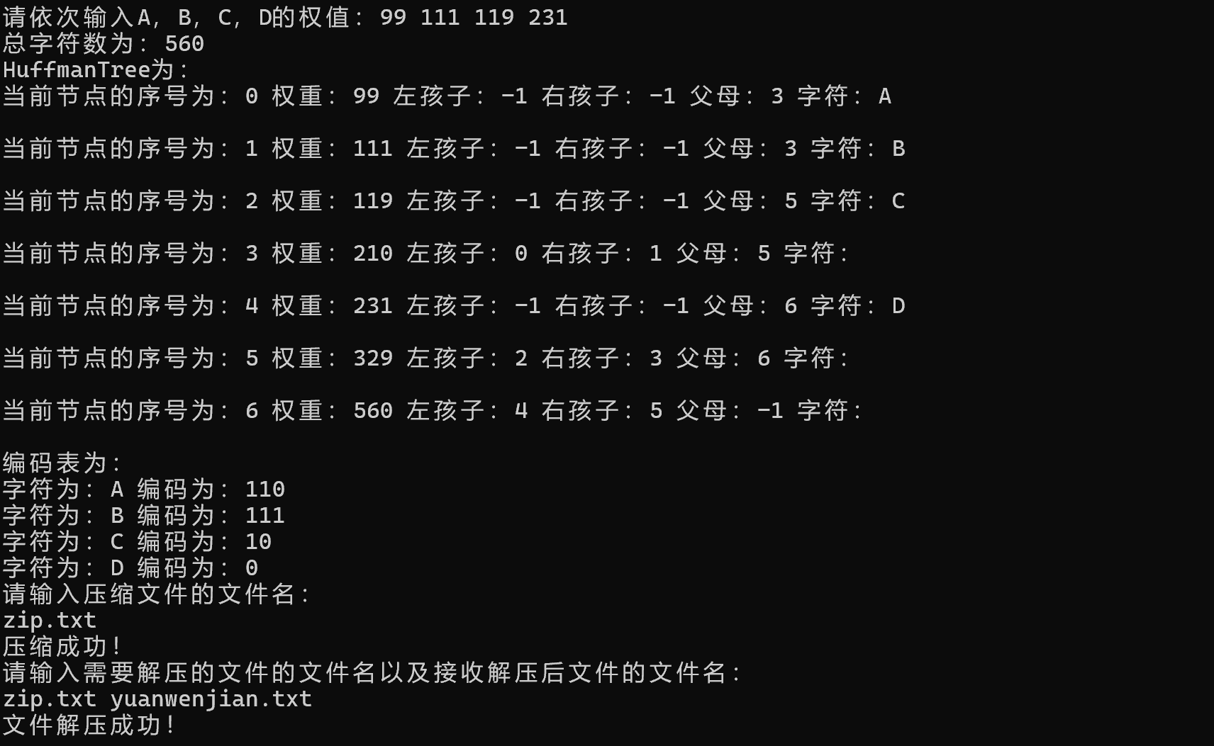 特别需要注意文件里面的换行符以及制表符等空白字符,这种字符虽然在文件里面可能不容易发现,但是仍然会被编码,相应的进行压缩以及解压缩操作 - 对于中文字符,该程序也是可以进行处理的,不过,由于每个中文字符在windows下占据的是3字节,所以程序计算一个中文字符会按照+3来计算,要想解决这个问题,似乎需要编码相关的知识,由于目前这样计算字节,程序也不算错,且作者还未学习编码相关知识,就先这样放着了