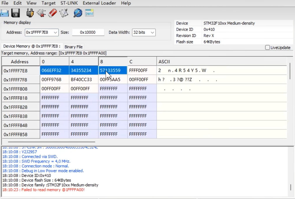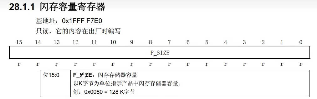 然后用上面的程序,读取一下闪存容量,就是我们手册中的地址,长度为4。