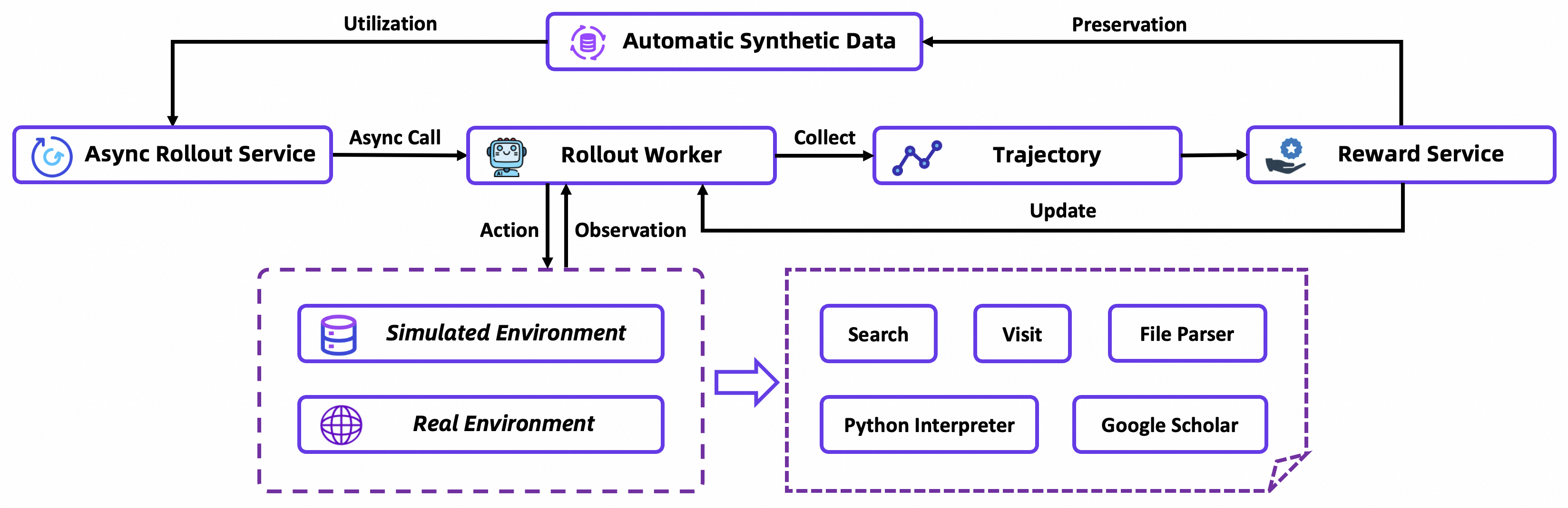 我们开发了一套端到端的合成数据生成解决方案。这一全自动流程无需人工干预即可构建超越人类质量的数据集,旨在突破智能体的性能极限。经过长期的探索和迭代------从早期的网页点击流逆向工程Benchmark(WebWalker)到基于图谱的合成方法(WebSailor 和 WebSailor‑V2),再到形式化的任务建模(WebShaper),我们的方法确保了卓越的数据质量和强大的可扩展性,突破了模型能力的上限。