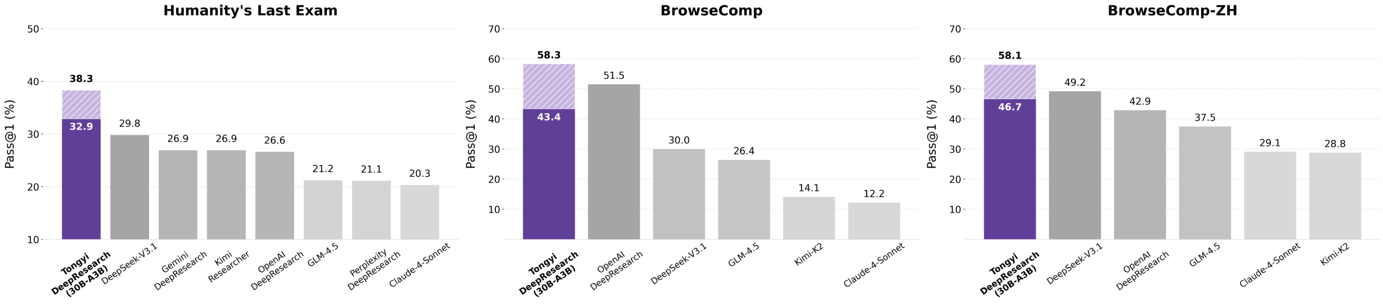 通义DeepResearch ------ 首个在性能上可与 OpenAI DeepResearch 相媲美、并在多项权威基准测试中取得领先表现的全开源 Web Agent。