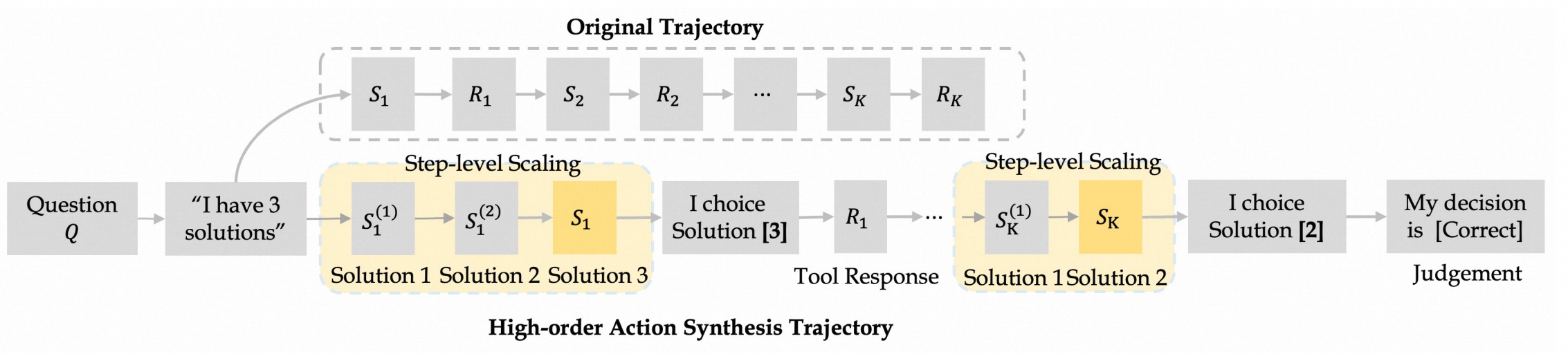 基于多风格问题和历史轨迹数据,我们分别构建了三种类型的动作数据,包含单步的规划、推理动作和多步的决策动作合成。我们的方法能够在离线环境下大规模、全面地探索潜在的推理‑动作空间,从而消除了对额外商业工具 API 调用的需求。例如,对于决策动作合成,我们将原始轨迹中的步骤进行扩展,并最终建模成多步骤决策过程数据,以激发模型的探索能力和决策能力。
