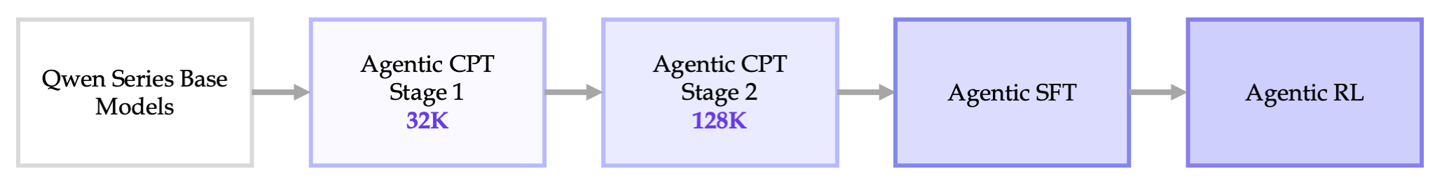 训练这样的Agent模型需要重新思考整个模型训练流程,从预训练到微调再到强化学习,我们建立了一套完整的智能体模型训练范式,将Agentic CPT → Agentic SFT → Agentic RL 连接起来,为 AI Agent创建了一个无缝的端到端训练循环。