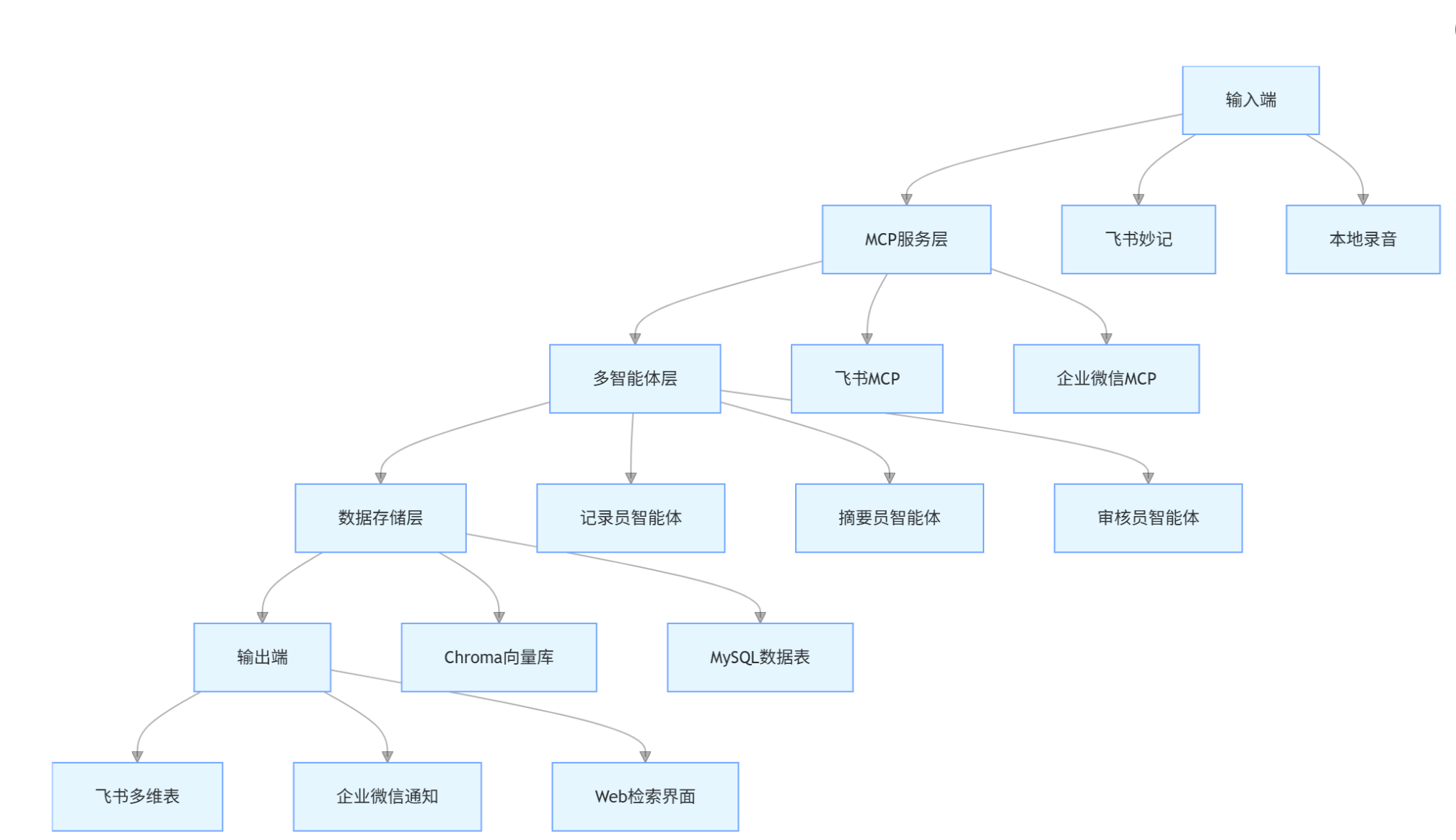 | 音频导入 | 支持飞书妙记 / 本地 MP3 上传 | MCP 服务(飞书 API) |