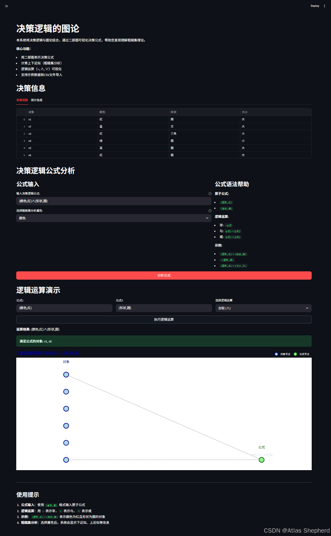 我来对这个决策逻辑图论系统进行深度详细解读。这个系统将粗糙集理论、决策逻辑和图论相结合,构建了一个强大的交互式分析工具。