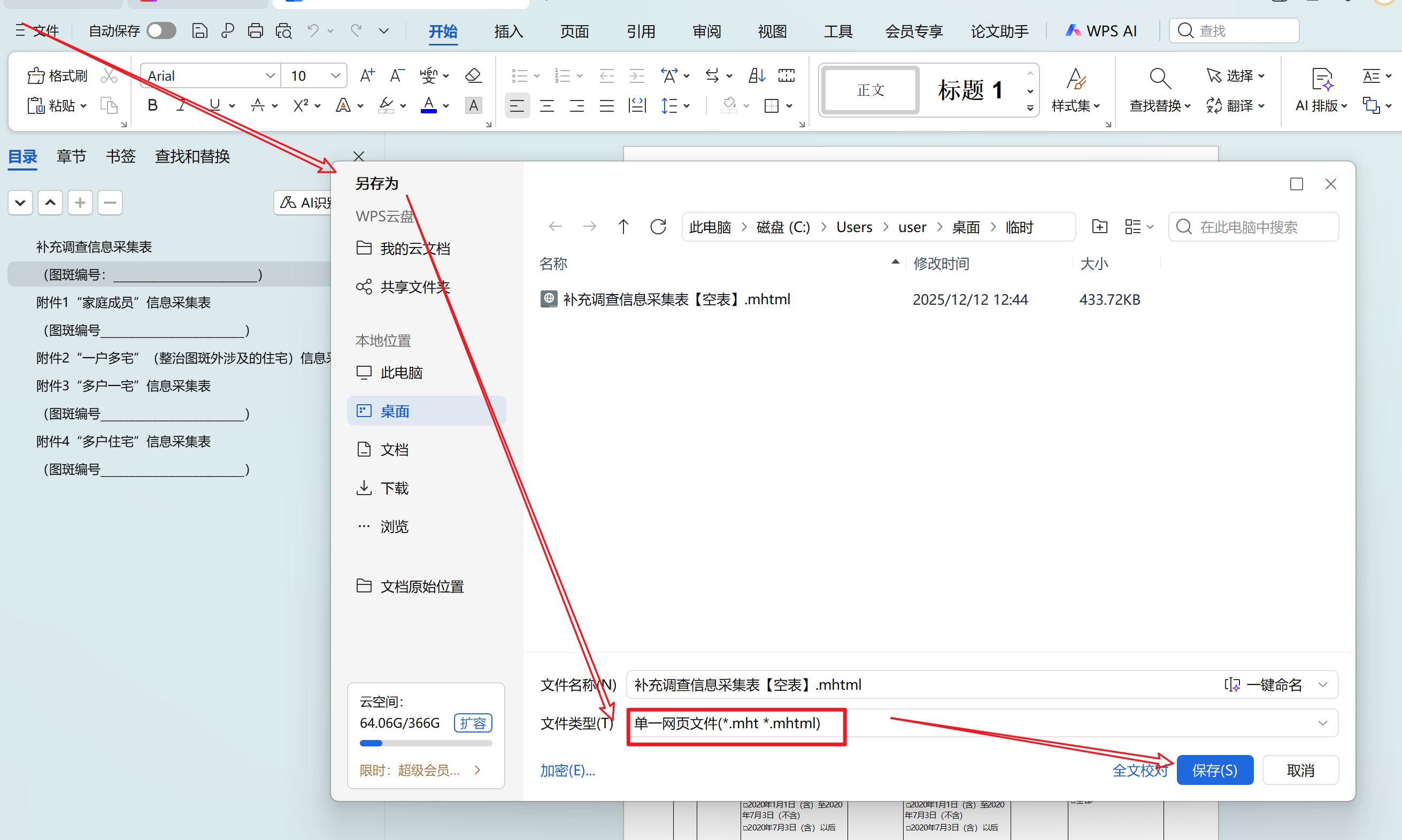3、接下来,是核心步骤,对word进行另存为操作,文件类型选择【单一网页文件】。