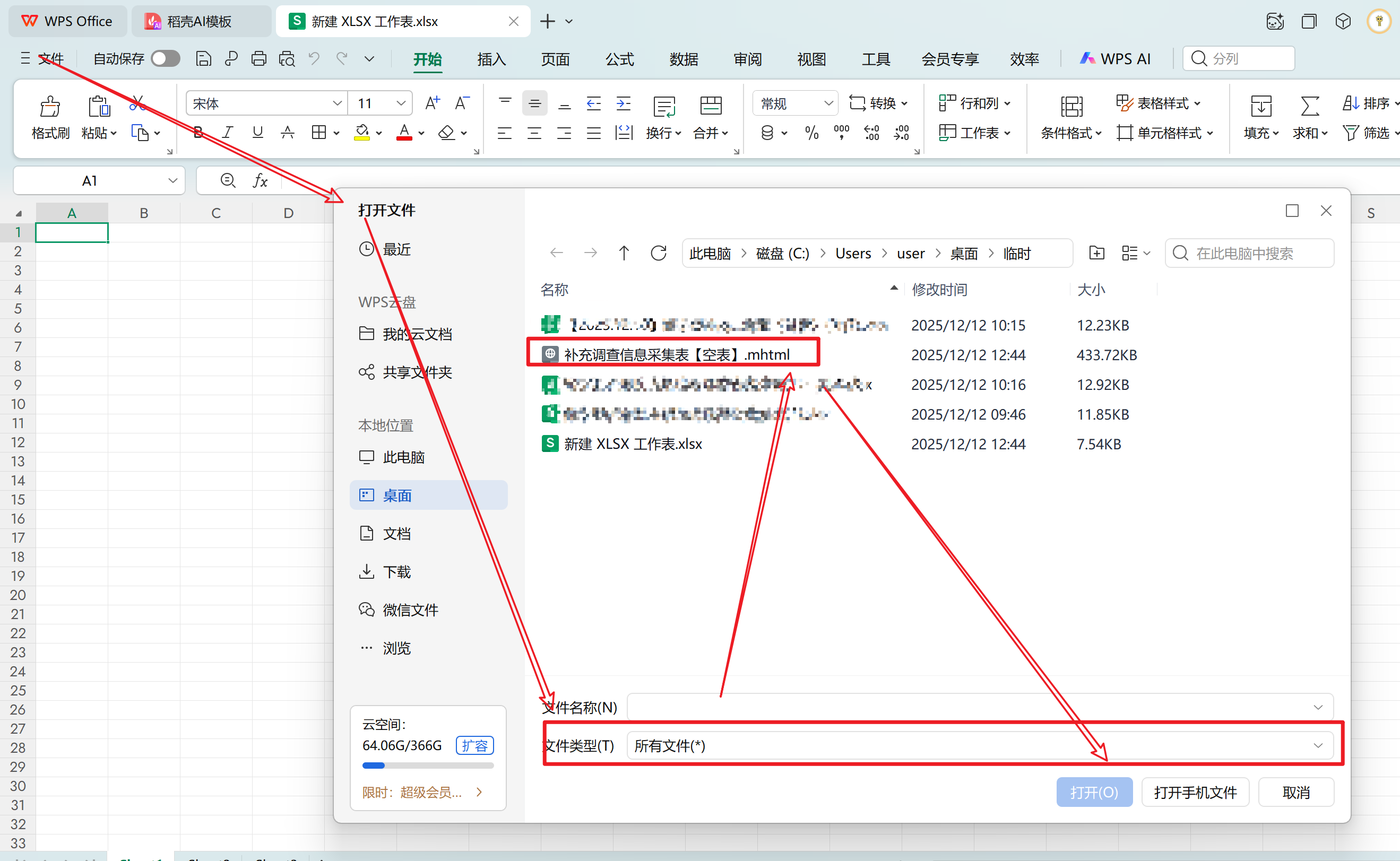 4、新建一个excel文件,打开文件,文件类型选择【所有文件】,打开后即可。
