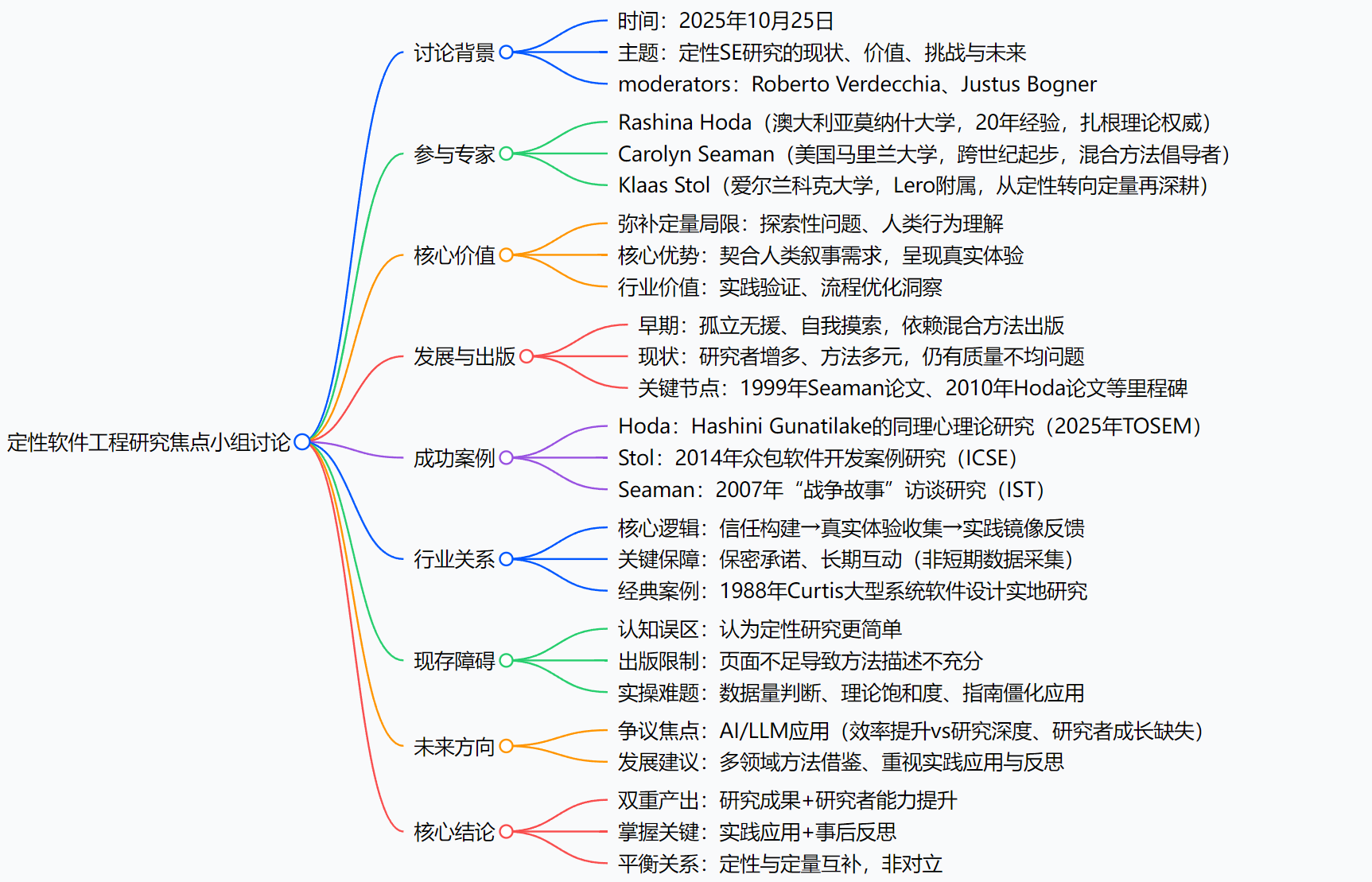本文通过三位资深专家的焦点小组对话,全景式展现了定性软件工程研究的发展全貌。从早期的孤立无援、出版困境,到如今的多元融合、行业认可,定性SE研究的核心价值始终是"捕捉人类行为的复杂性,填补理论与实践的鸿沟"。它以叙事为核心,以信任为纽带,既为学术研究提供了独特视角,也为行业实践提供了真实反馈。