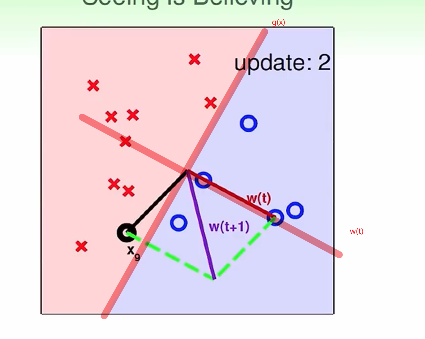 预期输出为Y=-1,在对比xg的时候,输出为y=1那么此时修正W。让WX往xg的反方向旋转,让最终的输出更加偏向于-1。于是,下一轮的W(t+1)就等于 Wt + y*X