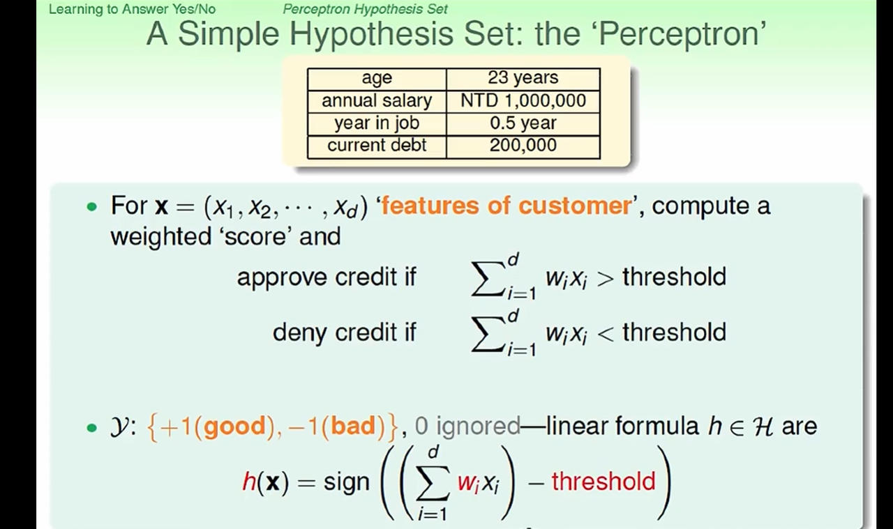 这是一个证明某人是否能够贷款的公式,当他的分数大于threshold的时候则认为可以贷款。相当于一个二分类。