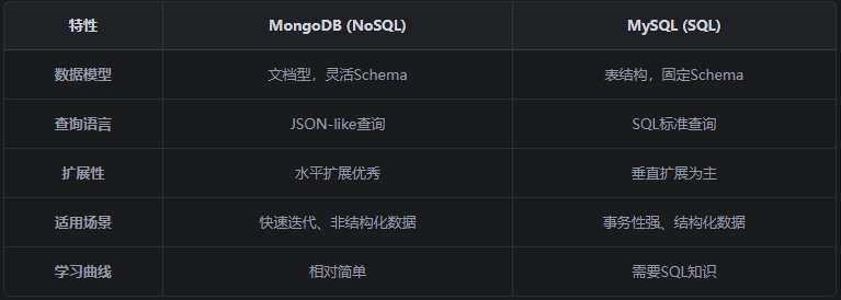 根据你给出的《安卓手机App开发教程规划(最终完善版)》,我学习到,第一部分:架构设计与环境搭建 的 第2章:开发环境配置,并完成了Android Studio安装与配置、Node.js环境搭建,请给出后续 "数据库选择与配置(MongoDB/MySQL)"的详细指导教程,如果输出受字数限制,可以提示我分多次输出