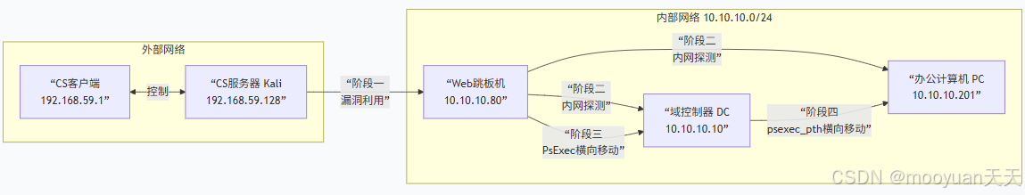 | 办公计算机 (PC) | 10.10.10.201 | Windows (域成员) | 横向移动目标 | PsExec横向移动控制(DC会话执行) |