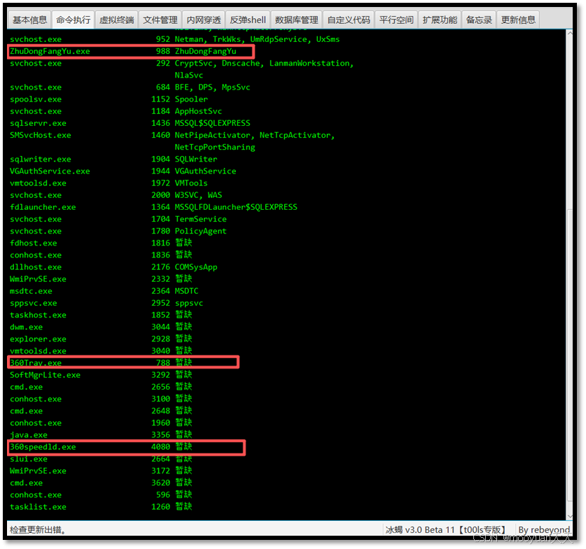 使用tasklist /svc查询进程,判断当前系统中启动的杀毒软件,注意下图红框中的安全进程。