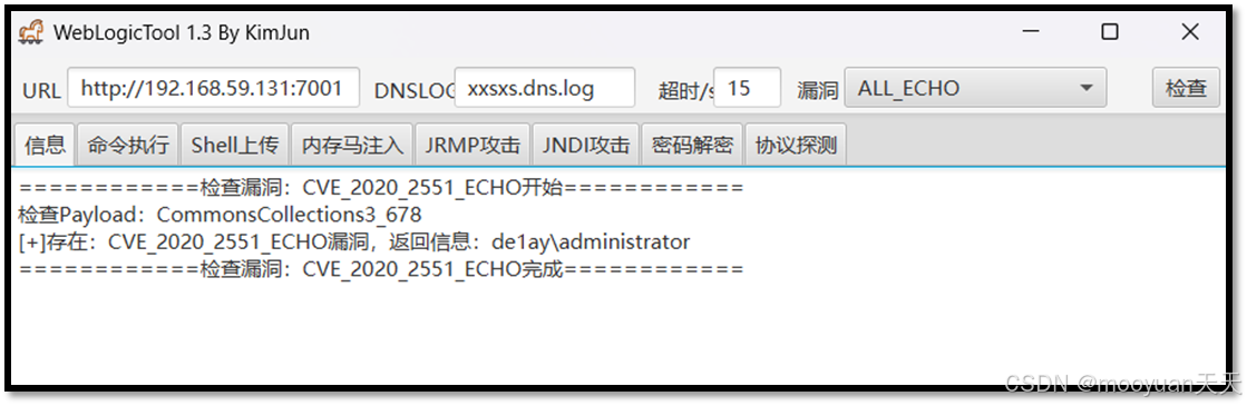 如上所示,发现了CVE_2020_2551_ECHO漏洞(CVE-2020-2551),根据返回结果判断当前服务为de1ay\administrator