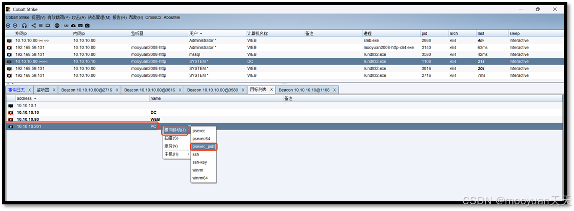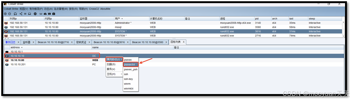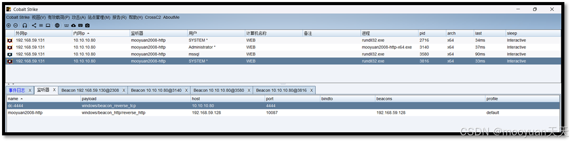 使用Cobalt Strike的端口扫描功能对Web服务器的内网10.10.10.0/24发起探测,如下所示。