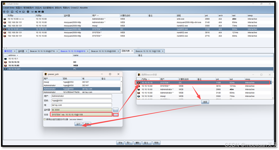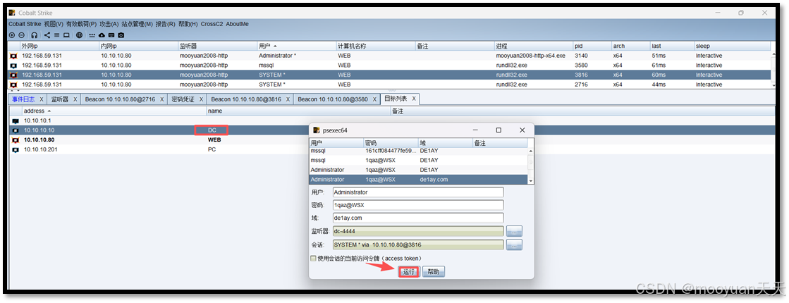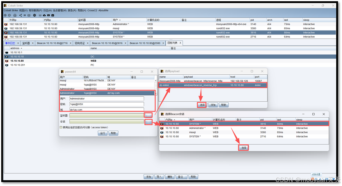 密码选择administrator对应的1qaz@WSX,会话选择DC域控会话,监听器选择DC-4444,具体如下所示。