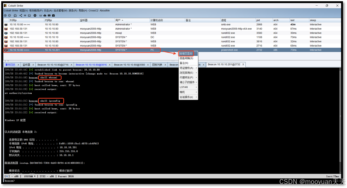 PC右键会话,执行whoami和ipconfig,如下所示。