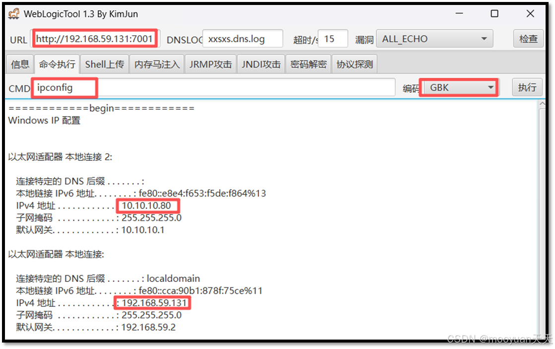 点击命令执行,输入ipconfig并点击执行,如下所示成功获取web服务器的ip地址信息,一个网段为192.168.59.0,这是我们kali攻击机与web系统连接的网段,另一个网段10.10.10.80则为内网网络。