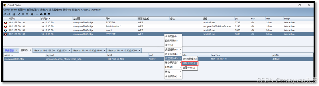 选中10.10.10.80的会话(mssql用户提权后的system用户),右键选择代理转发-转发上线。