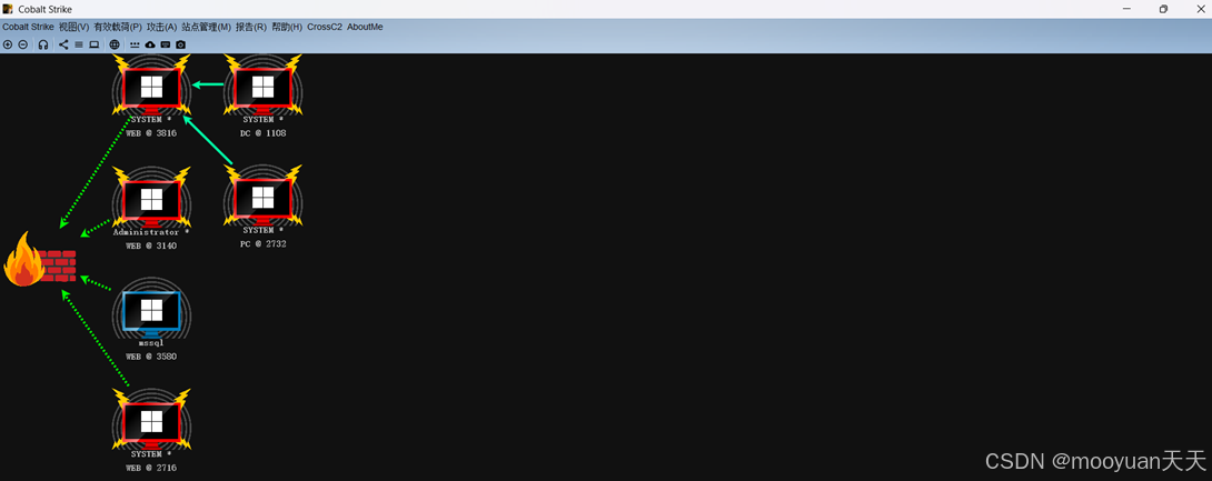 攻击链展示了从凭证利用 (make_token) 到 横向移动 (jump psexec) 的标准过程,而 rev2self 则体现了攻击者在操作过程中对权限管理的意识。最终结果就是攻击者成功地将他的控制范围从一台跳板机,扩展到了整个域的核心------域控制器