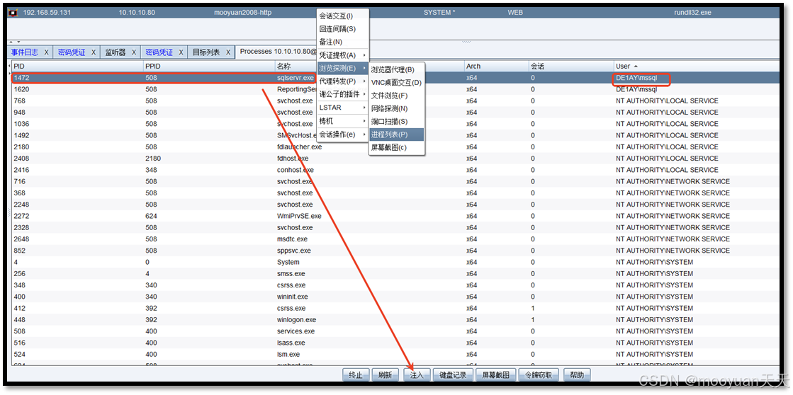 如果通过以其他用户上线的方法切换用户失败,右键"浏览探测-进程列表",对user进行排序,找到de1ay\mssql用户的进程sqlserver.exe,选中它然后点击注入,稍等即可同样上线mssql用户的CS。