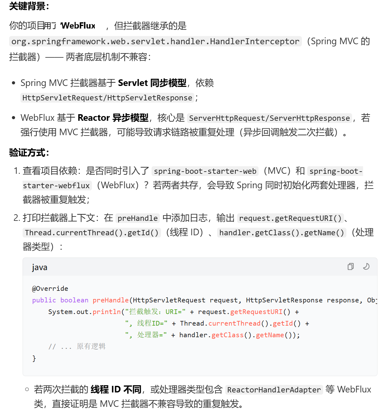 以上是一个MVC拦截器的声明,org.springframework.web.servlet.config.annotation.WebMvcConfigurer的路径拦截配置(如下)也没有问题。奇怪的是,用上面的拦截器拦截非流式方法时,这拦截器的com.zju.design.config.ApiSignInterceptorForHanfu#preHandle方法只会运行一次,如果用它拦截流式方法,则preHandle方法会运行两次,其中第二次是Controller方法运行结束后。注:此项目同时有SpringMVC和spring webflux依赖。