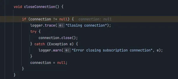 通过 Debug 跟踪,我发现在这两种异常处理流程中,尝试获取到的 connection 对象竟然都是 null。既然连接对象根本不存在,那么后续所有旨在关闭它的代码自然都无从执行。