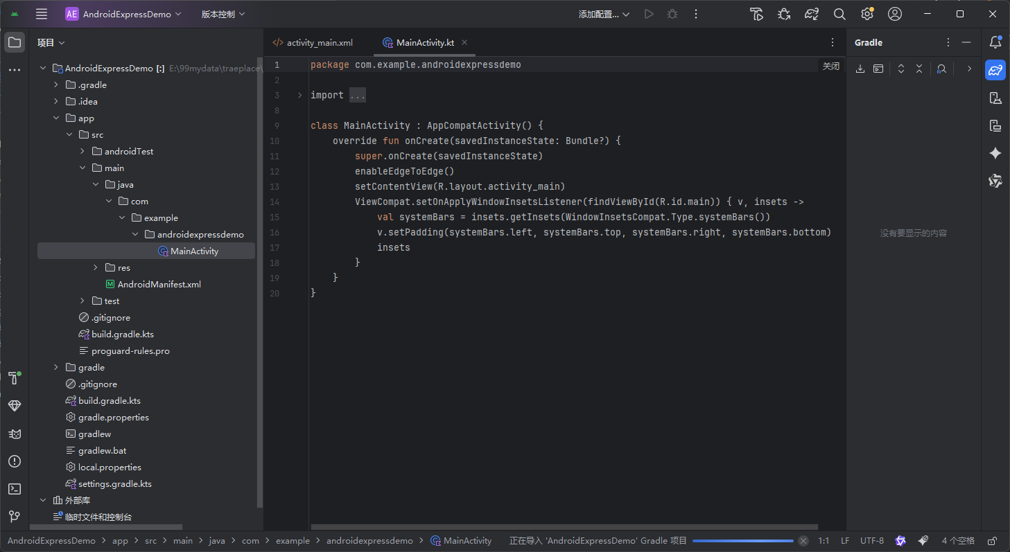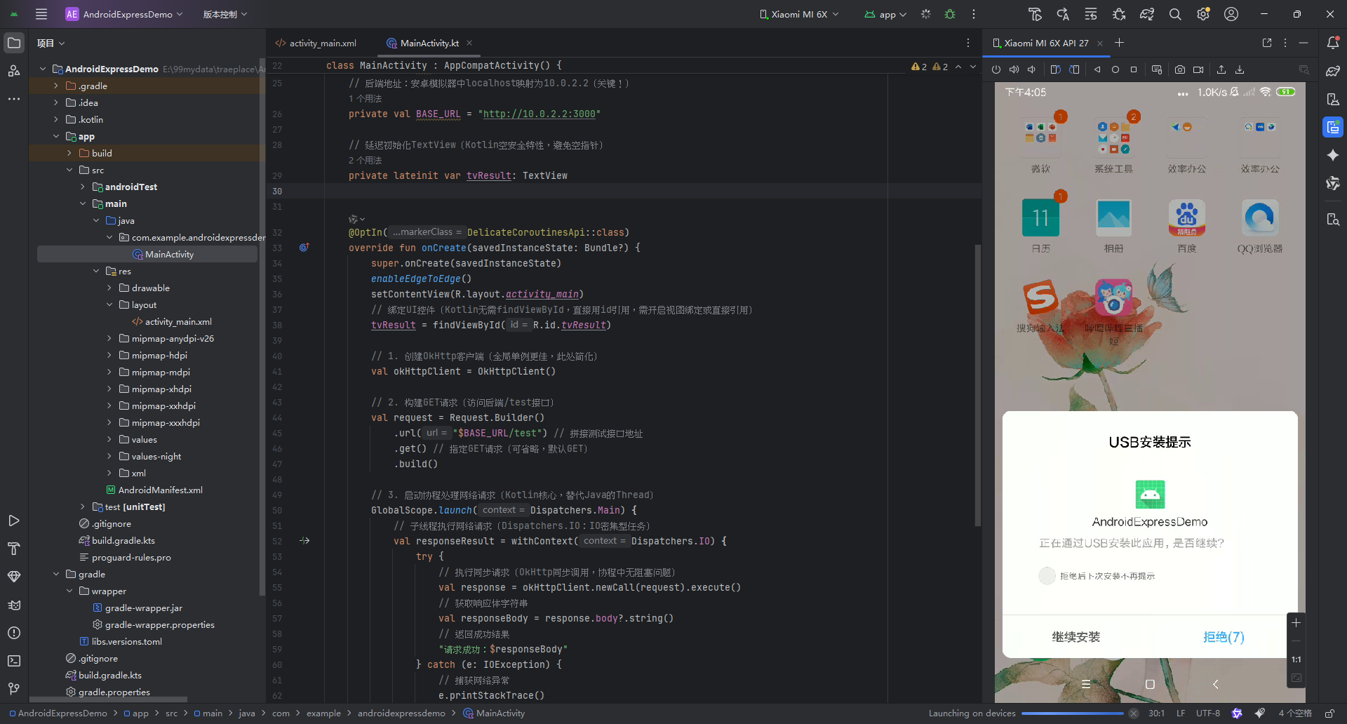 app/src/main/AndroidManifest.xml:安卓核心配置文件(权限、组件声明);app/src/main/java/com/example/androidexpressdemo/MainActivity.kt:主界面逻辑(Kotlin代码编写处);app/src/main/res/layout/activity_main.xml:主界面布局(UI控件);app/build.gradle:依赖配置文件(添加网络库、协程等依赖)。