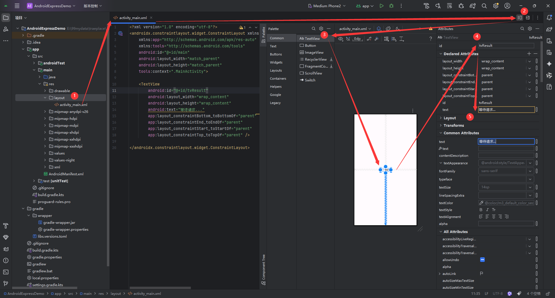 打开app/src/main/res/layout/activity_main.xml,添加TextView用于显示请求结果: