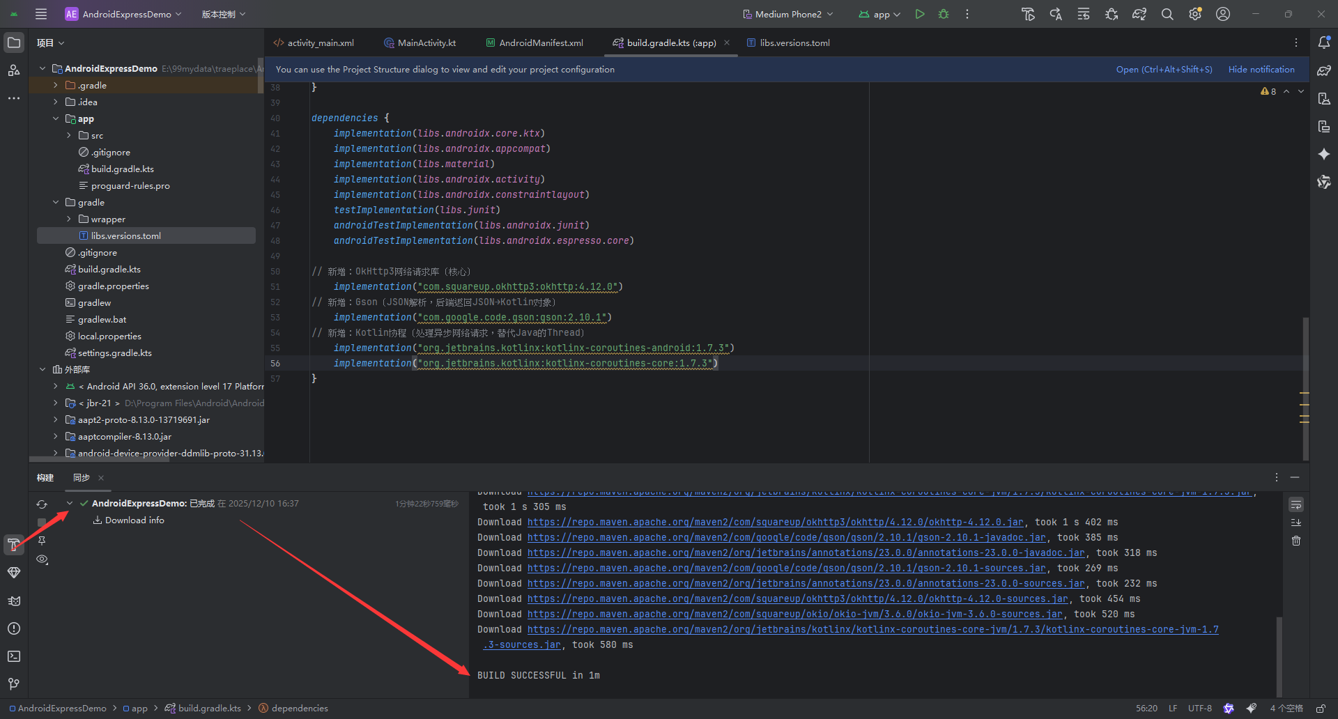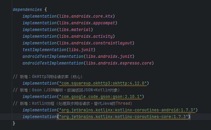 步骤3:添加核心依赖(OkHttp3 + Gson + Kotlin协程)
